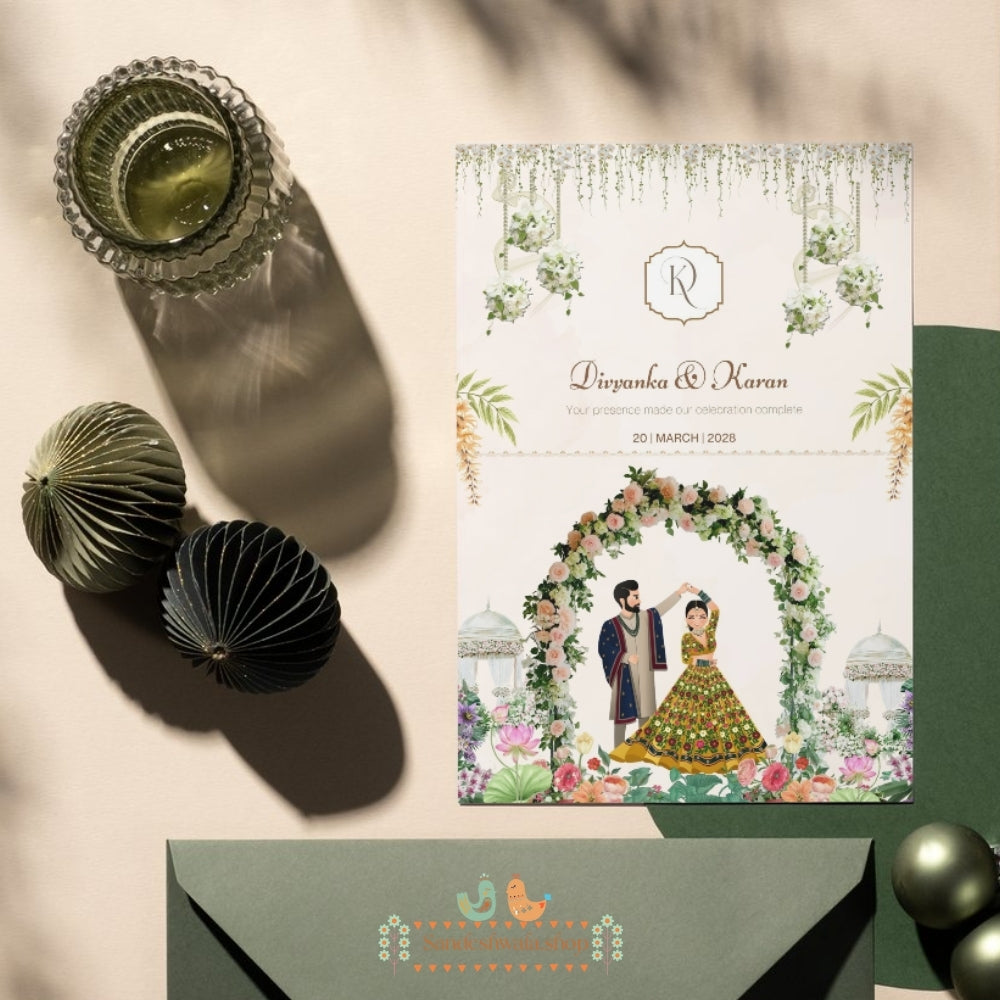 A dreamy, night-themed thank you card with palace lights and romantic detailing. Perfect for evening weddings, receptions, or sangeet events. Customised with names or a sweet message. Adds elegance to hampers, gift bags, and wedding kits, leaving guests with a magical, memorable touch.