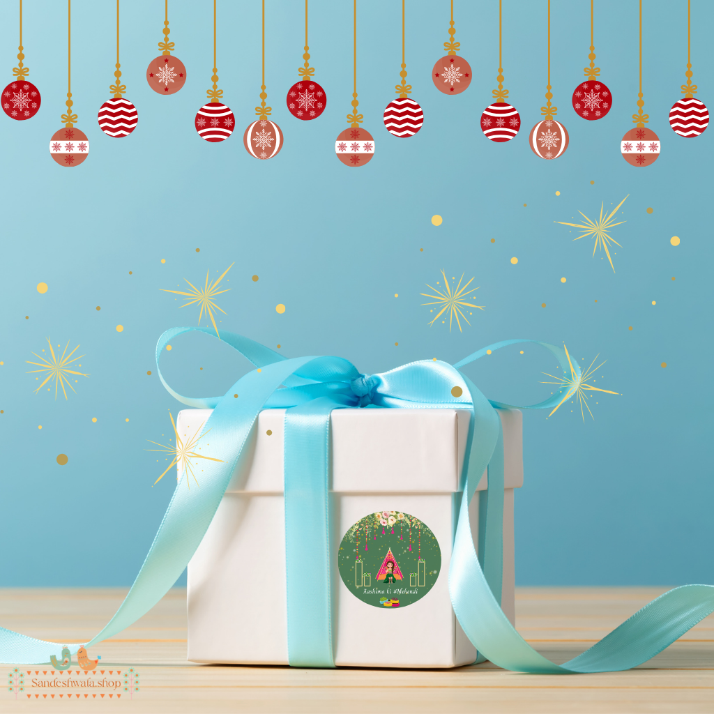 Great for mehendi favors, cones, trays, gift bags, and décor, this sticker brings life to every detail. Its rich colors and intricate elements make it stand out as a memorable and stylish event accessory.